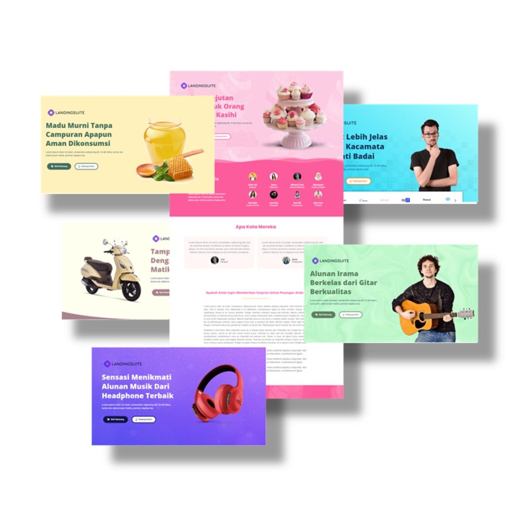 Jelajahi puluhan template landing page produk fisik dalam plugin Landingsuite yang colorful dan eye catching. Mulai dari fashion, sepatu, aksesoris hingga alat musik, semua ada didalamnya. Produk anda tidak ada didalamnya? Jangan khawatir, karena semua template Landingsuite sangat fleksibel dan mudah diedit menyesuaikan dengan produk anda.